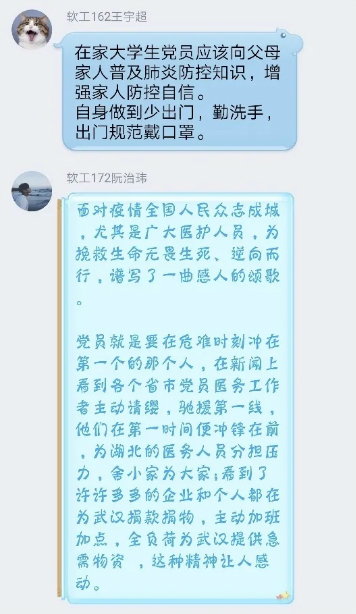 支部书记谢超凡老师围绕以下三个主题开展线上讨论,各位大学生党员结合近段时间的心得收获,纷纷袒露自己的心声,为抵抗和战胜这次来势汹汹的疫情献出自己的绵薄之力。