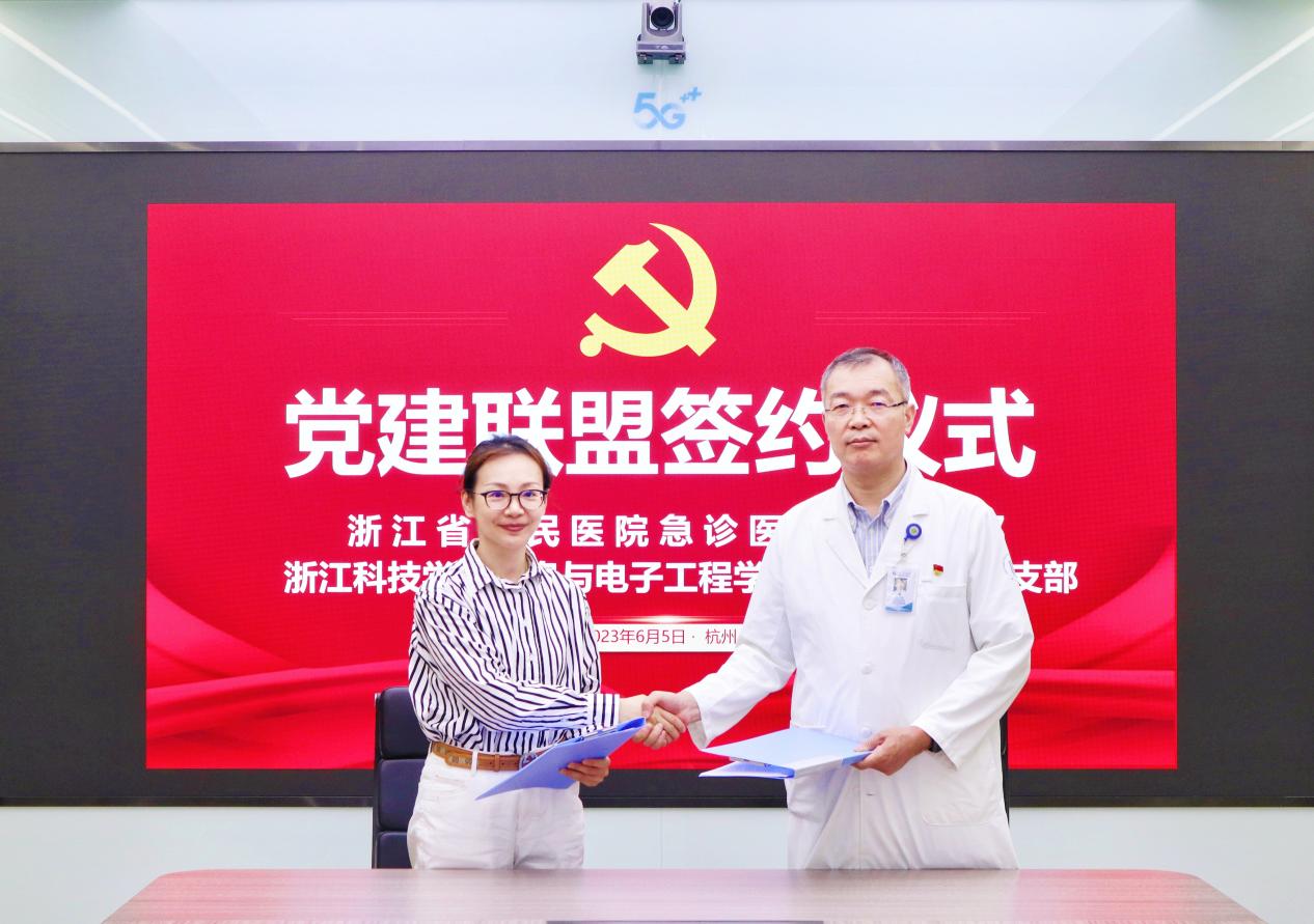 2023年6月5日,我院比特实验室党支部与浙江省人民医院急诊医学科党支部签订党建联盟。学院党委书记张蕾、比特实验室党支部书记陈芳妮、省人民医院急诊科主任蔡文伟、急诊科主任助理缪小燕出席本次签约仪式。比特实验室党支部书记陈芳妮与浙江省人民医院急诊科主任蔡文伟签署党建联盟协议,双方就业务发展、工作模式、志愿活动等合作内容达成共识。