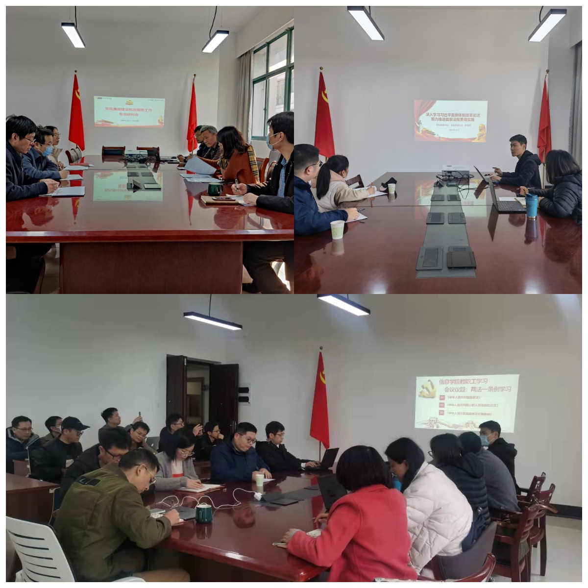 信息学院纪委在校纪委的指导下,认真做好“两法一条例”普法宣传工作方案,以学院纪委班子成员带头学,督促学院党组织开展理论学习中心组专题学习,结合教职工政治理论学习及党支部主题党日活动契机,纪委全体成员进联系支部、系部进行专题普法宣讲,组织全体教职工重点学习了省纪委省监委“两法一条例”专题讲座视频。在学院形成学习“两法一条例”普法学习新热潮,努力实现“两法一条例”学习宣传“全覆盖”工作。