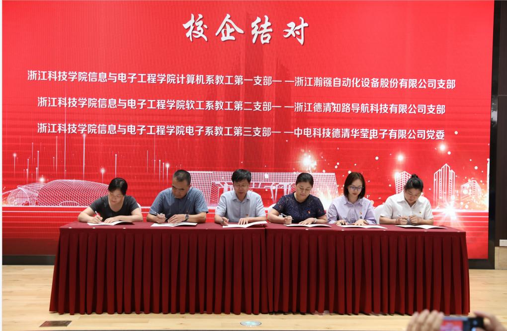 仪式上,信息学院党委书记张蕾,高新区党工委委员沈亦红共同为“双科技”联盟揭牌,学院三个教工支部分别与浙江瀚镪自动化设备股份有限公司支部、浙江德清知路导航科技有限公司支部和中电科技德清华莹电子有限公司党委进行校企结对。