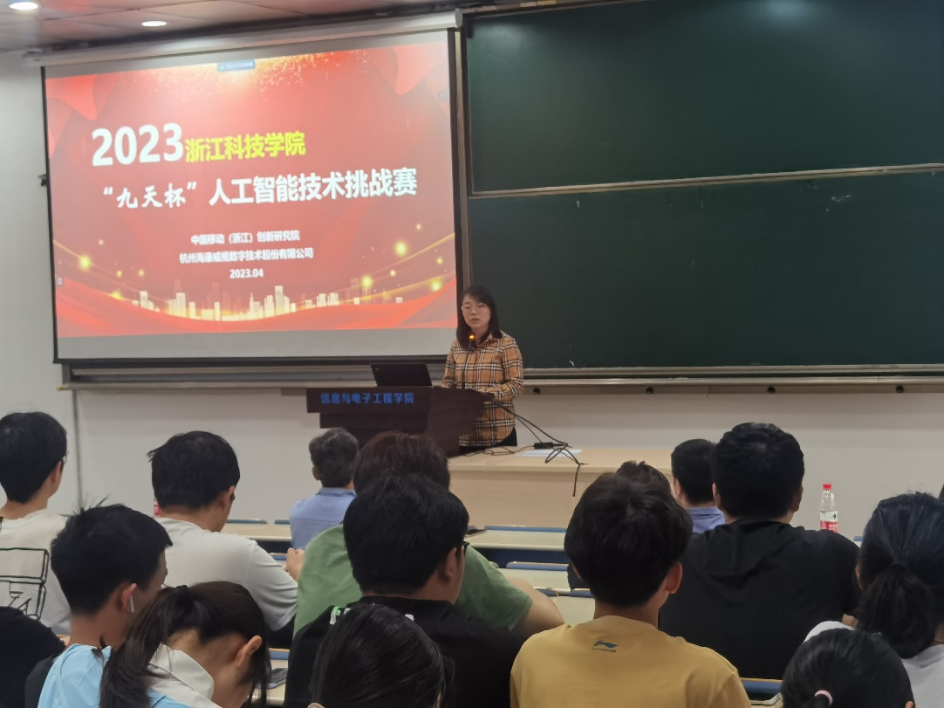 2023年4月18日,赛事启动仪式暨赛题发布会召开,信息学院、电气学院、理学院等相关专业教师与学生近200人参会,安吉校区部分学生通过视频会议方式参加。教务处副处长刘洪民代表学校对竞赛的举办表示欢迎,感谢合作企业的大力支持,并介绍了学校对学科竞赛的政策支持以及近年来所取得的成绩。信息与电子工程学院书记张蕾肯定了企业命题对锻炼学生应用创新能力的重要作用,希望今后能够进一步深化多种形式的校企合作,鼓励学生积极参加竞赛,预祝取得好的成绩。中国移动(浙江)创新研究院副院长蒋健重点介绍了本届“九天杯”人工智能技术挑战赛的相关信息,并分享了中国移动九天・毕昇平台为高校师生所提供的人工智能领域的课程学习、竞赛、科研、求职、教学等一站式云端服务。海康威视杭州分公司郭兴锋总监介绍了公司二十年来的发展历程与在新时代背景下公司的转型,并邀请学生未来能够加入海康威视。