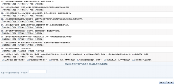 4. 分别针对给定的评价指标对任课教师授课质量作出评价,如有对课程教学的意见和建议也可在文本框中输入,对当前教师的评价结果提交后,系统显示下一门课程的评价页面。