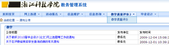 2、登陆系统后,选择菜单“教学质量评价2—>教学质量评价”,如图所示: